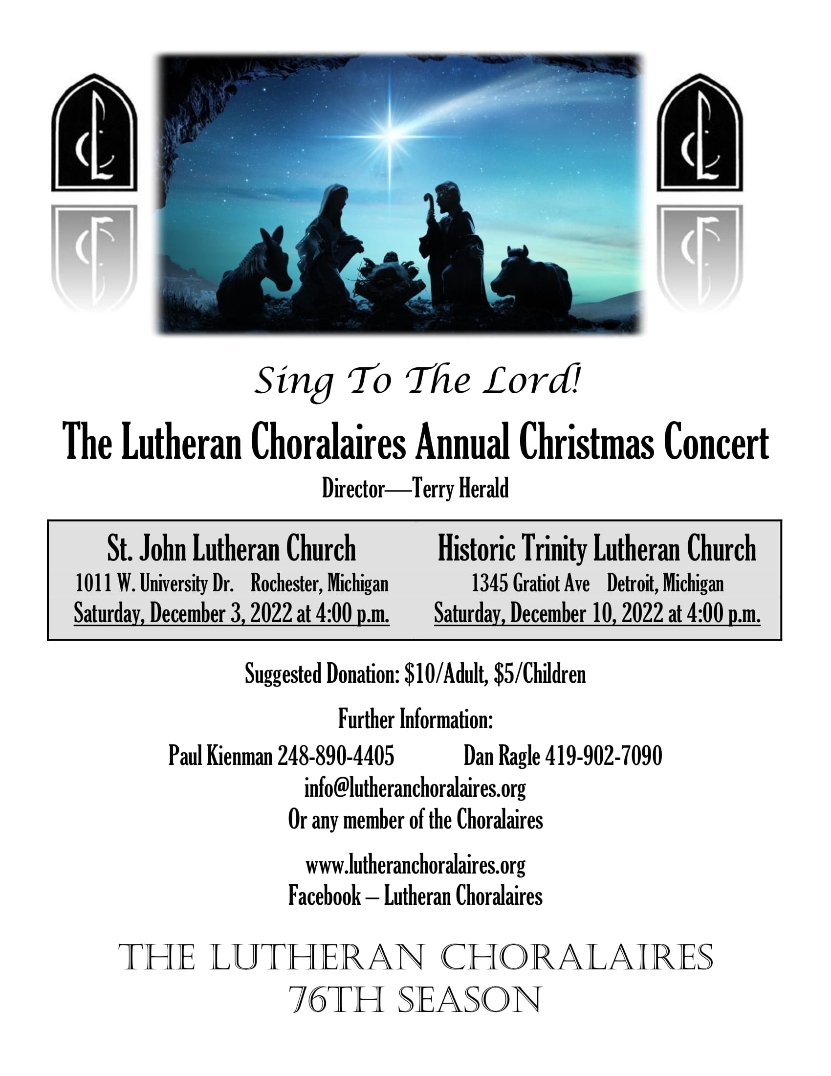 Please join as we celebrate the birth of our Lord Jesus Christ! Entitled Sing To The Lord, this year's concert will be presented on two dates: December 4th, and December 10th. Take your pick, or come to both!